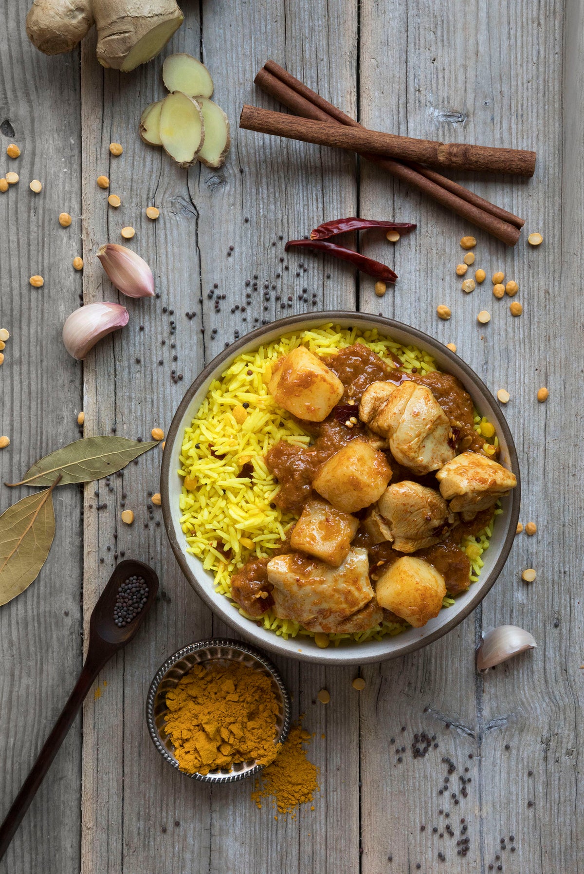 Vindaloo originated in the 1500s from India’s early Portuguese colonists. To preserve their meats for long ocean voyages to Goa (a state in western India where Portugal’s colonies were thriving) the Portuguese used to pickle their meats in wine and garlic. Our modern day Vindaloo includes potatoes and uses vinegar with fresh ginger and select spices resulting in a delicious tangy dish that uniquely blends sweet, sour and spicy tastes. Complementing our chicken Vindaloo’s flavor all the more, we serve this dish with our ever popular Basmati Lemon Rice.