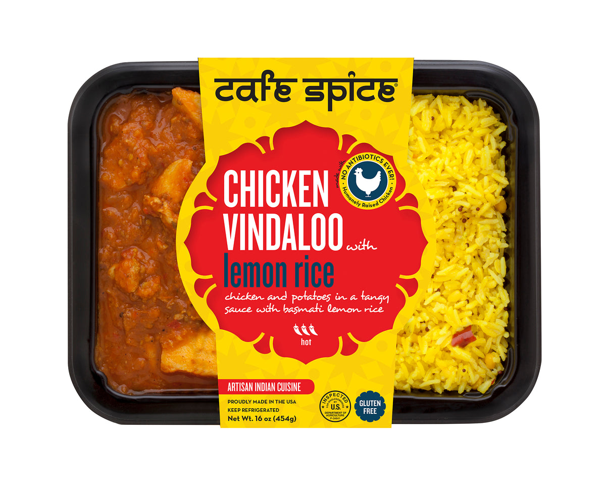 Chicken Vindaloo Ingredients:: Chicken Raised Without Antibiotics (boneless), Onions, Potatoes, Tomatoes, Tomato Puree (tomatoes, water, citric acid), Expeller Pressed Canola Oil, Vinegar, Water, Ginger, Garlic, Cultured Dextrose, Salt, Red Chilies, Coriander, Cumin, Turmeric, Paprika, Garam Masala (spice blend), Cloves, Cinnamon, Black Pepper, Mustard Seeds, Bay Leaves, Cardamom