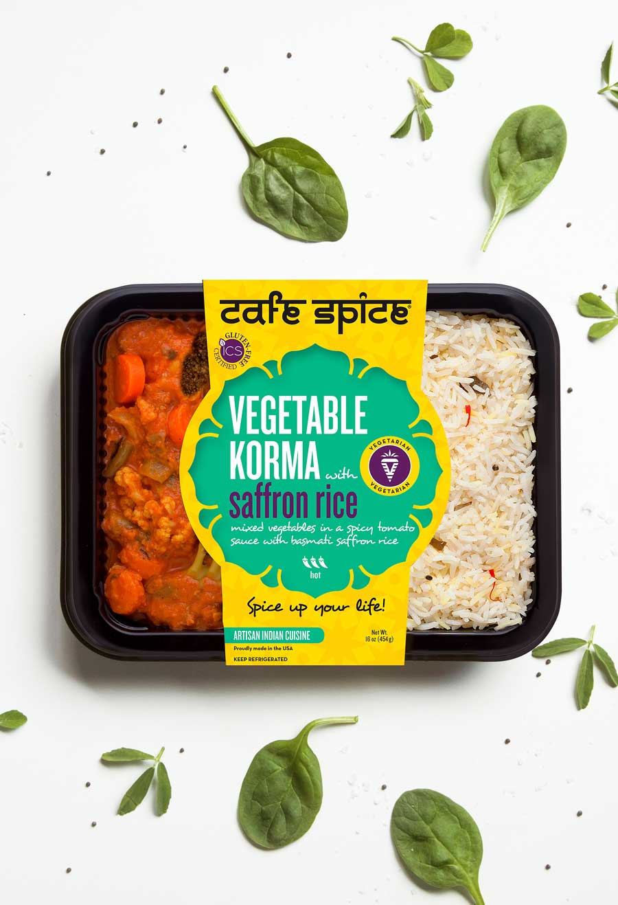 Korma is a popular dish that varies from region to region. Our vegetarian korma is inspired by the recipes most common to North India. It combines a medley of vitamin-rich vegetables braised with our select blend of Indian spices, then cooked to perfection in a spicy tomato-cream sauce. This dish is paired with a serving of Basmati saffron rice, which is grown in the Himalayan foothills, prepared with real saffron threads and cooked with whole cardamom pods and bay leaves.